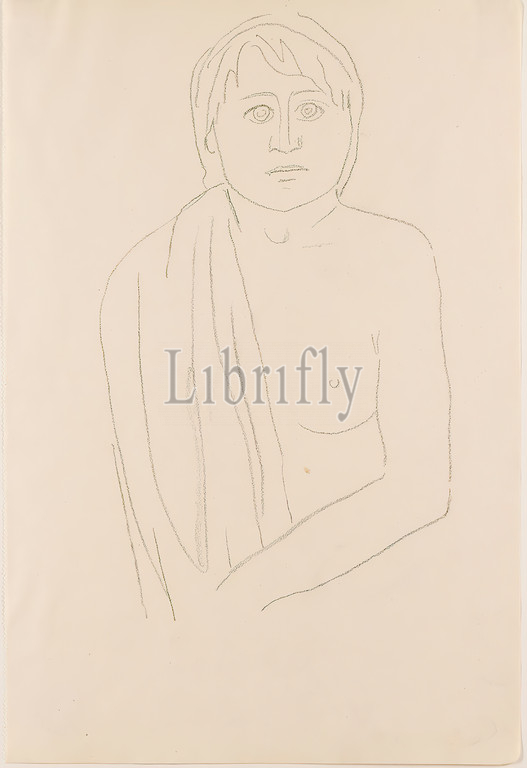 Gustav Heinrich Wolff, Female nude with headscarf, drawing paper, drawing charcoal, drawing, charcoal on drawing paper, total: height: 29,9 cm; width: 20 cm, drawing, graphics, sketches, female nude, seated female nude, classical modernism, sketch of a half figure en face, woman with naked upper part of the body, with headscarf and fixed gaze, from the sketchbook 1928.