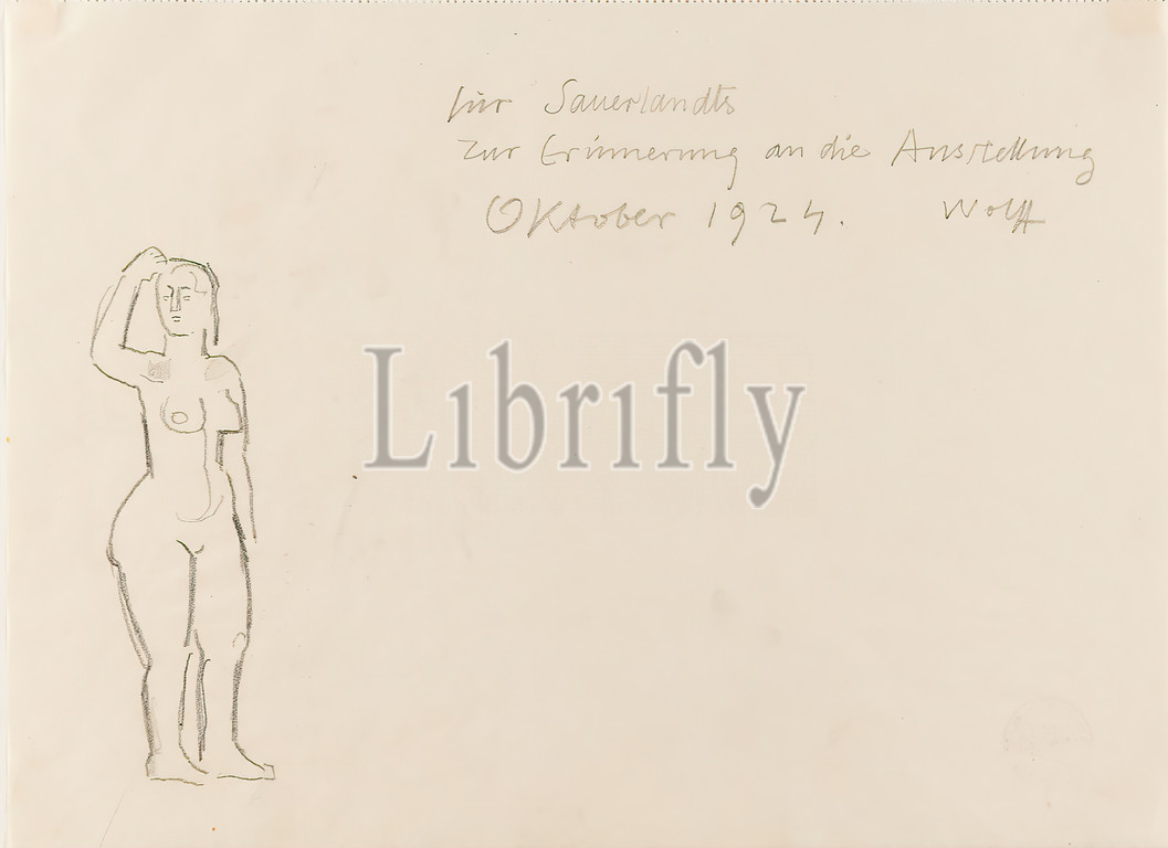 Gustav Heinrich Wolff, Female Nude, pencil, parchment, drawing, pencil on parchment, Total: Height: 19.7 cm; Width: 26.9 cm, signed, dated and inscribed: recto o. re.: for Sauerlandts in memory of the exhibition October 1924. Wolff, drawing, graphics, sketches, design drawings, female nude, standing female nude, classical modernism, inscribed and signed by the artist for Sauerlandts in memory of the exhibition October 1924. Wolff, from sketchbook IX.1924