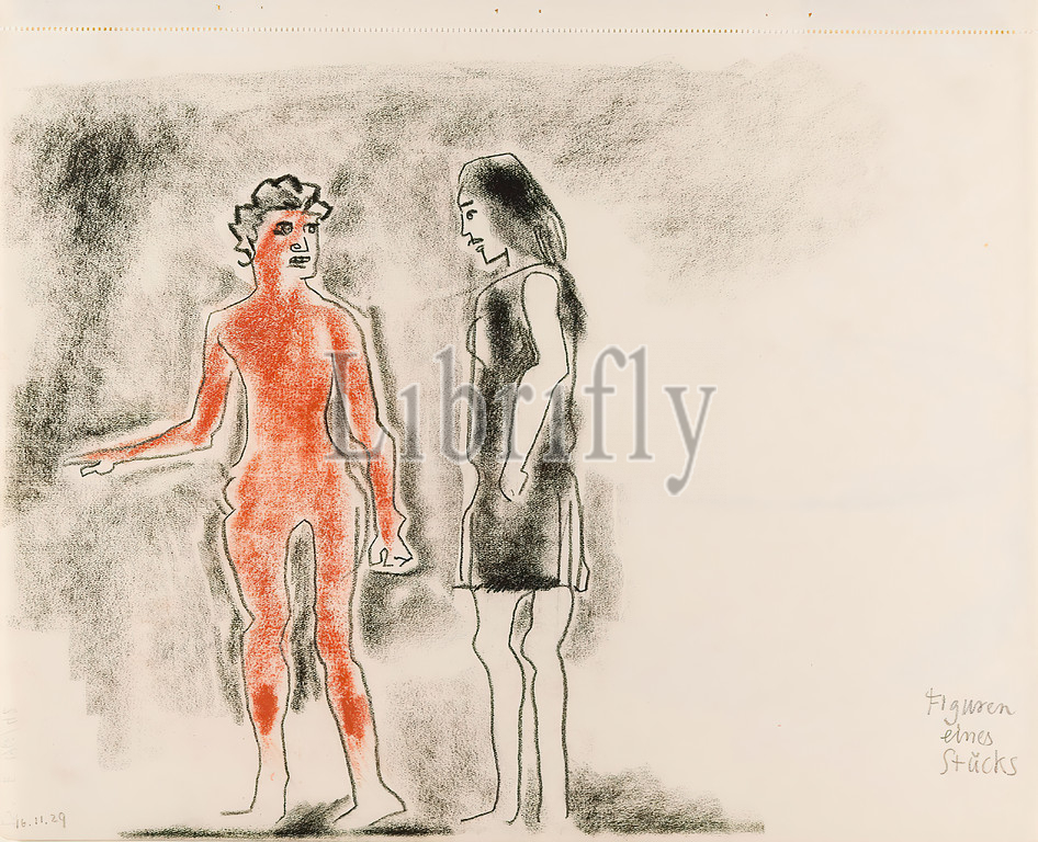 Gustav Heinrich Wolff, figures of a piece, drawing paper, red chalk, drawing charcoal, drawing, charcoal and red chalk on drawing paper, total: height: 26.8 cm (incl. perforated margin); width: 25.6 cm; depth: 33 cm, bottom right inscribed with pencil: Figures of a piece, sketches, free graphics (drawing, graphics), drawing, graphics, human body/figure/nude, lit. characters, classical modernism, single sheet (Bl. 25 of 28) from the sketchbook October to November 1929.