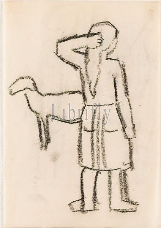 Gustav Heinrich Wolff, girl, sheep, parchment, charcoal, drawing, drawing, charcoal, parchment paper, unmarked, drawing, graphics, sketches, postures, positions, human figure, sheep, herding cattle, back, human, animal, Classic Modernism, sketch, February 1923 sketchbook