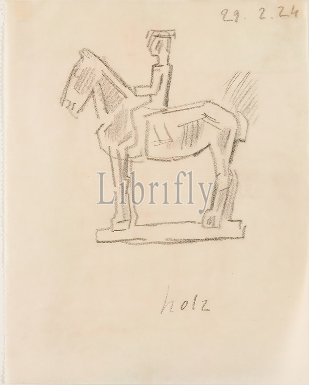 Gustav Heinrich Wolff, Horse, rider, pencil, parchment, drawing, pencil, parchment, inscribed, dated, recto inscribed wood, lower center, dated 29.2.24, Sketches, sketches, design drawings, horse, equestrian statue, sculpture, plastic, sculptural art, classical modernism, horse, pedestal, rider, profile, left, inscribed wood, lower center, artist, dated 29.2.24, Single sheet, sketchbook Febr.-Date, 29.2.24, March 1924