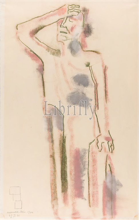 Gustav Heinrich Wolff, Kassandra, pastel chalk, drawing paper, drawing, pastel on drawing paper, total: height: 41 cm; width: 25.6 cm, recto lower left inscribed and dated in pencil: Cassandra. Stone. 2 1/2 m 27 5 [or 9?] 31, sketches, history of Cassandra, sculpture, sculpture, sculptural art, specific poses, gestures, facial expressions, classical mythology/antique history, classical modernity, pastel drawing from a sketchbook (sheet 23): design for a 2.5 meter high stone sculpture, marked by the artist as Cassandra.