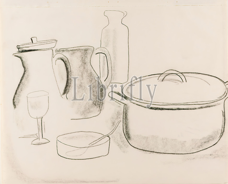 Gustav Heinrich Wolff, life, pot, jugs, drawing paper, drawing charcoal, drawing, charcoal, drawing paper, incl, perforated rim, unmarked, sketches, drawing, graphics, free graphics, drawing, graphics, life, life, various objects, food, drink, classic modernism, life, pot, lid, two jugs, jugs, bottle, bowl, spoon, wine glass, Single sheet, Bl, November 1929