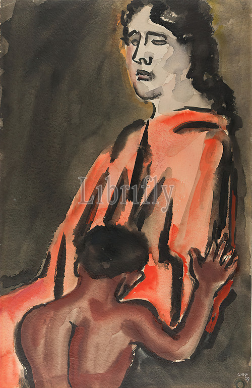 Gustav Heinrich Wolff, love of a goddess, cardboard, watercolor, watercolor on cardboard, Total: Height: 50.7 cm; Width: 32.9 cm, Recto lower right monogrammed and dated with opaque color: GHW 29. verso lower right with pen inscribed Liebe zu einer Göttin, free graphic, painting, Drawing, graphic, classical mythology/antique history, seated figure, gods (classical. mythology), classical modern