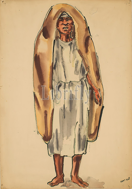 Gustav Heinrich Wolff, Moroccan farmer's wife, Bäuerin vom Gharb, ink, non-opaque watercolor, cardboard, pen-and-ink drawing, watercolor, ink, watercolor, brownish cardboard, dated, recto lower right, pen, GHW 1928, inscribed, verso lower, pen, Bäuerin vom Gharb, portrait, standing figure, peasant woman, peasant wife, peoples, nationalities, Classic Modernism