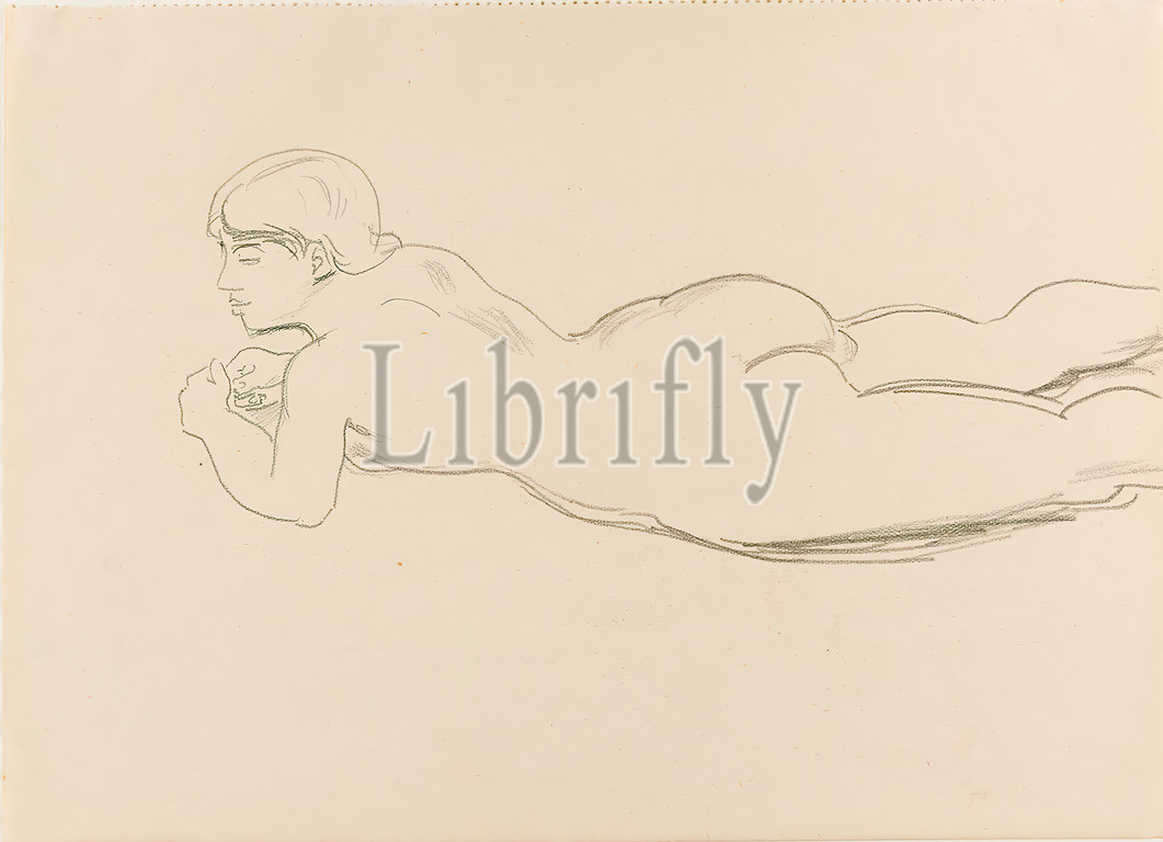 Gustav Heinrich Wolff, Nude lying on the stomach, pencil, drawing paper, drawing, pencil on thin drawing paper, total: height: 19,4 cm; width: 27 cm, drawing, graphics, sketches, lying female nude, female nude on the back, female nude, lying figure, Classic Modernism, Nude lying on the stomach, from the sketchbook Summer 1927.