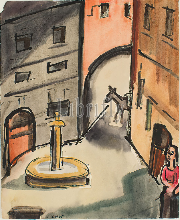 Gustav Heinrich Wolff, Platz mit Brunnen, Badajoz, cardboard, watercolor, ink pen, watercolor, cardboard, monogrammed, recto lower left, pen, GHW, pen, Badajoz, undated, free graphic, Drawing, graphic, landscapes, waters, city view, streets, squares, facade, house, building, monuments, fountains, towers, city, city view, veduta, donkey, hist, Building, Location, Street, Spain, Badajoz, Extremadura, Classic Modern