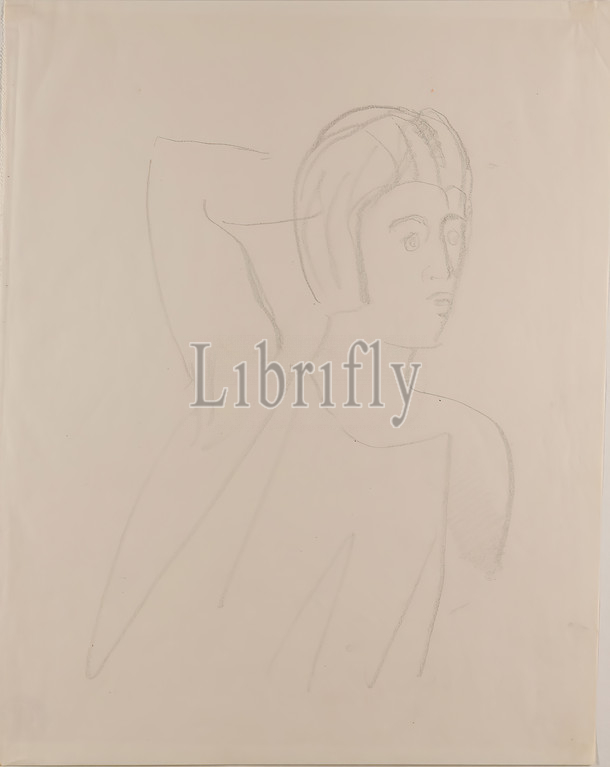 Gustav Heinrich Wolff, portrait study, drawing paper, drawing charcoal, drawing, charcoal on drawing paper, total (lower right slightly trimmed?): height: 33.3 cm; width: 27 cm, drawing, graphics, sketches, woman, portrait, Classic Modernism, Female bust in half profile to the right, right arm crossed behind the head; very pale charcoal drawing from the sketchbook early 1928.