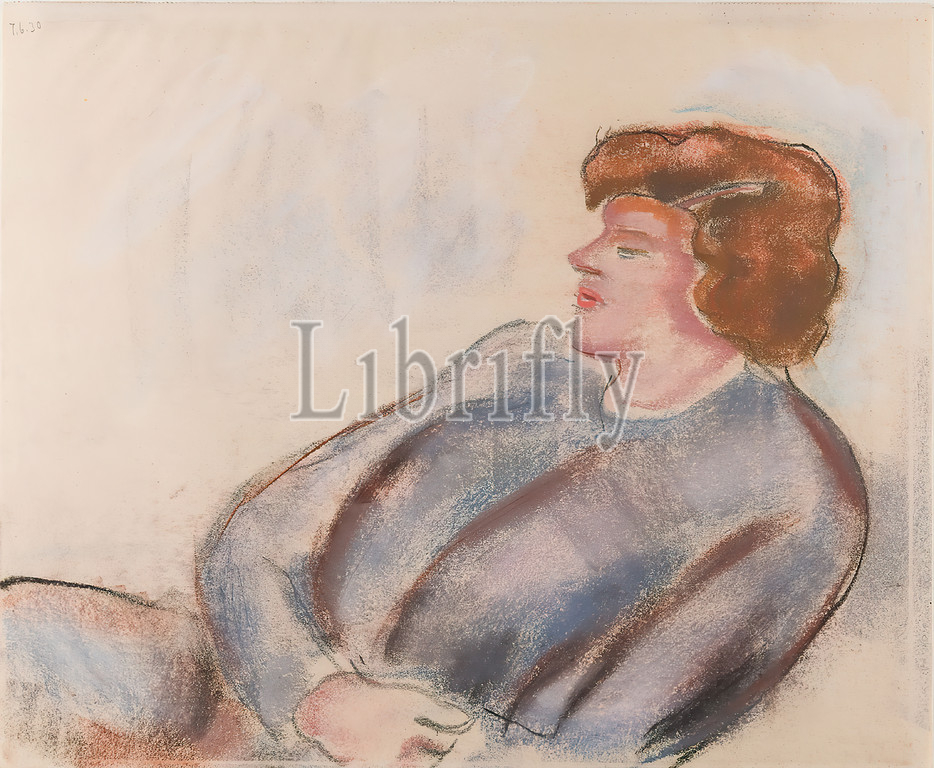 Gustav Heinrich Wolff, portrait study of a woman, pastel chalk, drawing paper, drawing, pastel on thin drawing paper, total: height: 30.6 cm; width: 37.1 cm, dated: recto upper left with pencil: 7.6.30, drawing, graphics, sketches, portrait, seated figure, woman, profile (side view), Classic Modernism, single sheet from the sketchbook 1929/30.