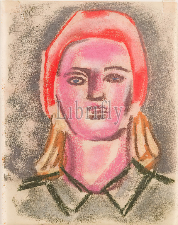 Gustav Heinrich Wolff, Portrait, woman, red headscarf, Russian Sketchbook, parchment, drawing, pastel chalk, parchment, Drawing, graphic, sketches, portrait, bust, en face, head, face, woman, headdress, classical modernism, portrait sketch, woman en face, greyish-greenish clothing, blond hair, blue eyes, red headscarf, Russian Sketchbook, Sketchbook 1932-34