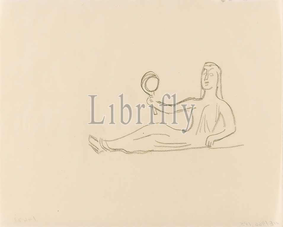 Gustav Heinrich Wolff, reclining figure with mirror (I), pencil, parchment, drawing, pencil on parchment, Total: Height: 17.5 cm; Width: 21.9 cm, unmarked, sketches, drawing, graphics, reclining figure, mirror, Classical Modernism, single sheet (pg. 10) from the sketchbook October to December 1924 (partly created during Wolff's stay in Hamburg) Possibly created as a study in connection with the relief Aphrodite and Charis (1925), see Holthusen (1964) Plastik Nr. 65.