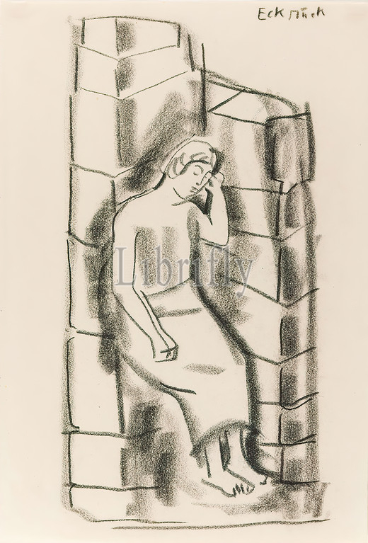 Gustav Heinrich Wolff, Sitting in a corner (corner piece), drawing paper, drawing charcoal, drawing, charcoal on drawing paper, Total: Height: 29,7 cm; Width: 20,3 cm, inscribed: recto top right with charcoal: corner piece, Drawing, graphic, sketches, sitting figure, classic modernism, sketch of a woman sitting in a brick corner, undated single sheet from sketchbook.