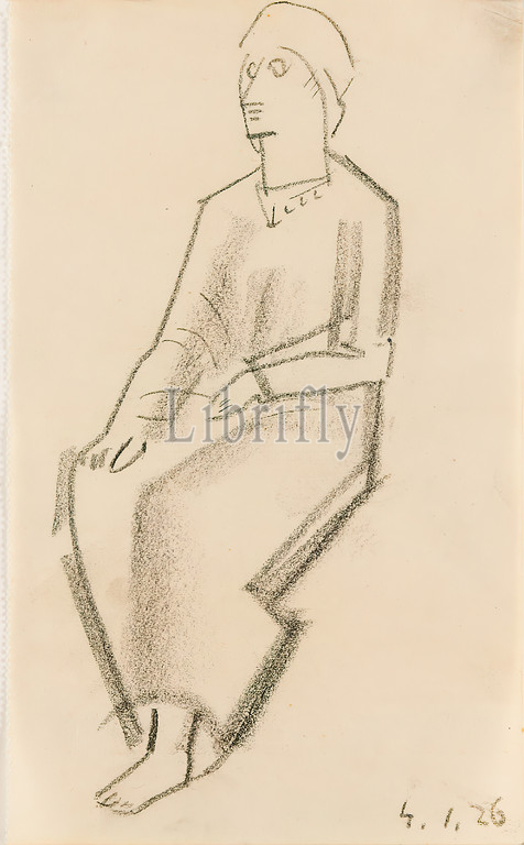 Gustav Heinrich Wolff, Sitting woman in long dress, drawing paper, drawing charcoal, drawing, charcoal on drawing paper, Total: Height: 20 cm; Width: 12,2 cm, dated, 4.1.26, Sketches, drawing, graphics, Sitting figure, woman, Classic Modernism, Sketch of a sitting woman in long dress and with headgear in half profile to the left, from the Sketchbook 1926.