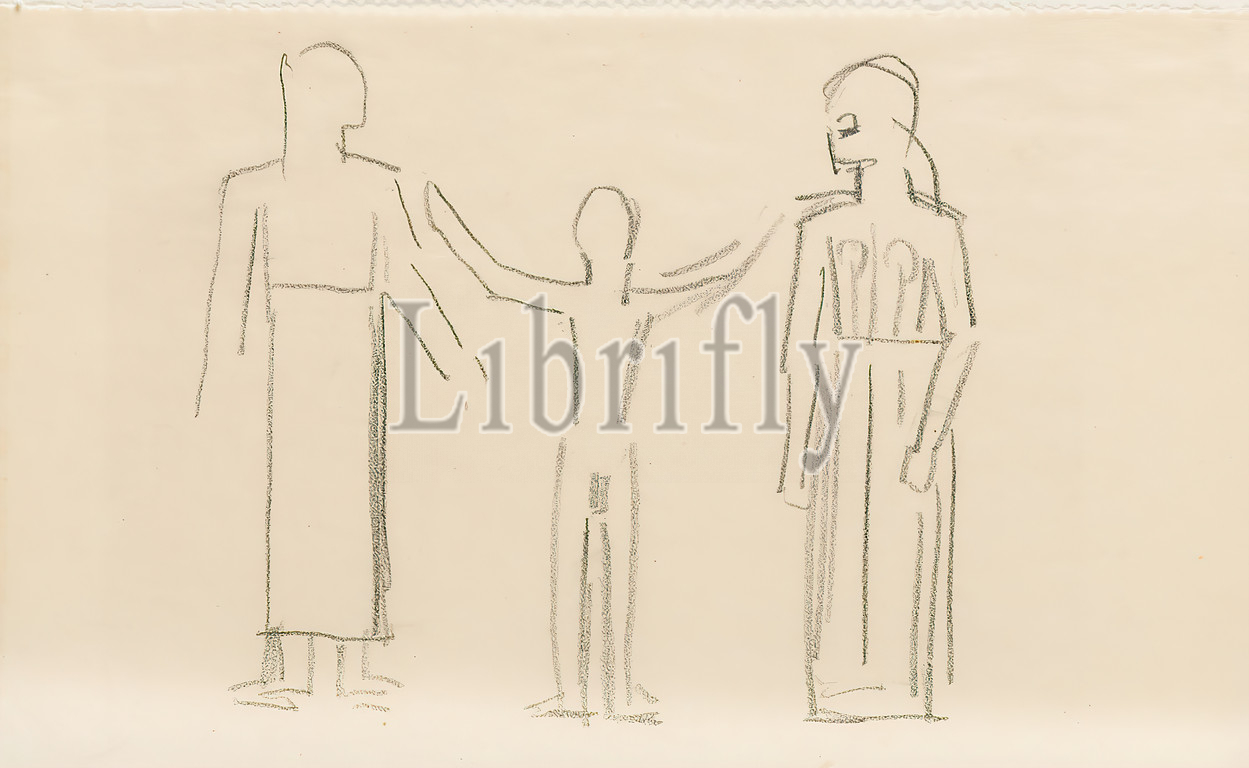 Gustav Heinrich Wolff, sketch, three figures, design, Eumenides, pencil, parchment, drawing, pencil, parchment, drawing, graphics, sketches, design drawings, standing figure, history, Orestes, history, Apollo, Phoebus, history, Minerva, Pallas, Athena, classical mythology, antique history, Greek heroes, furies, Dirae, Erinnyen, Eumenides, classical modernism, single sheet, sketchbook 1923, design drawing, copper engraving, Eumenides, Orestie 3, Orest, boy, Apollo, Athena, 110