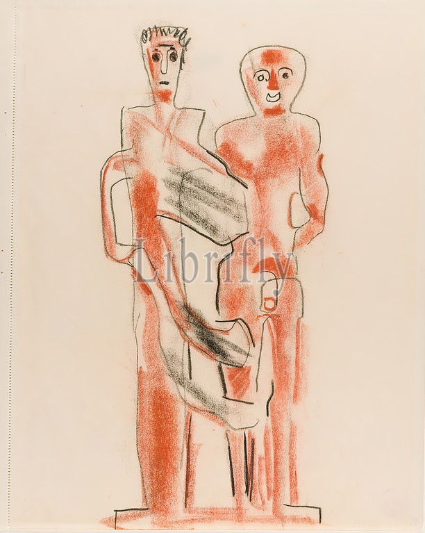 Gustav Heinrich Wolff, sketch, two standing figures, drawing paper, red chalk, drawing charcoal, drawing, charcoal, red chalk, drawing paper, incl, perforated margin, unmarked, sketches, drawing, graphics, human body, figure, nude, standing figure, sculpture, plastic, sculpture art, classical modernism, sketch, two standing male nudes, highly abstracted forms, front view, left figure, indicated cloth, garment, Obviously design, sculpture, Single sheet, Bl, November 1929