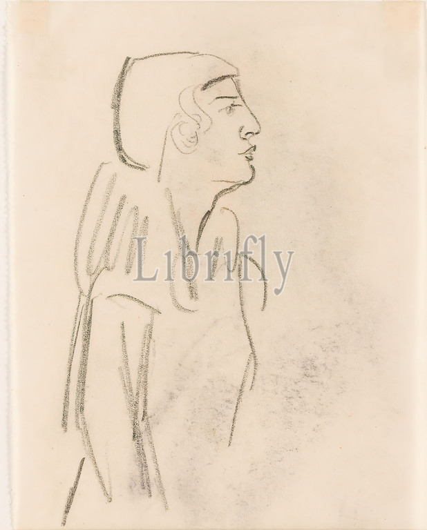 Gustav Heinrich Wolff, sketch, woman, profile, pencil, parchment, drawing, pencil, parchment, verso, someone else?, dated, pencil, graphic, sketches, standing figure, profile, side view, classical modernism, female half figure, headgear, profile, sketchbook 1932-34