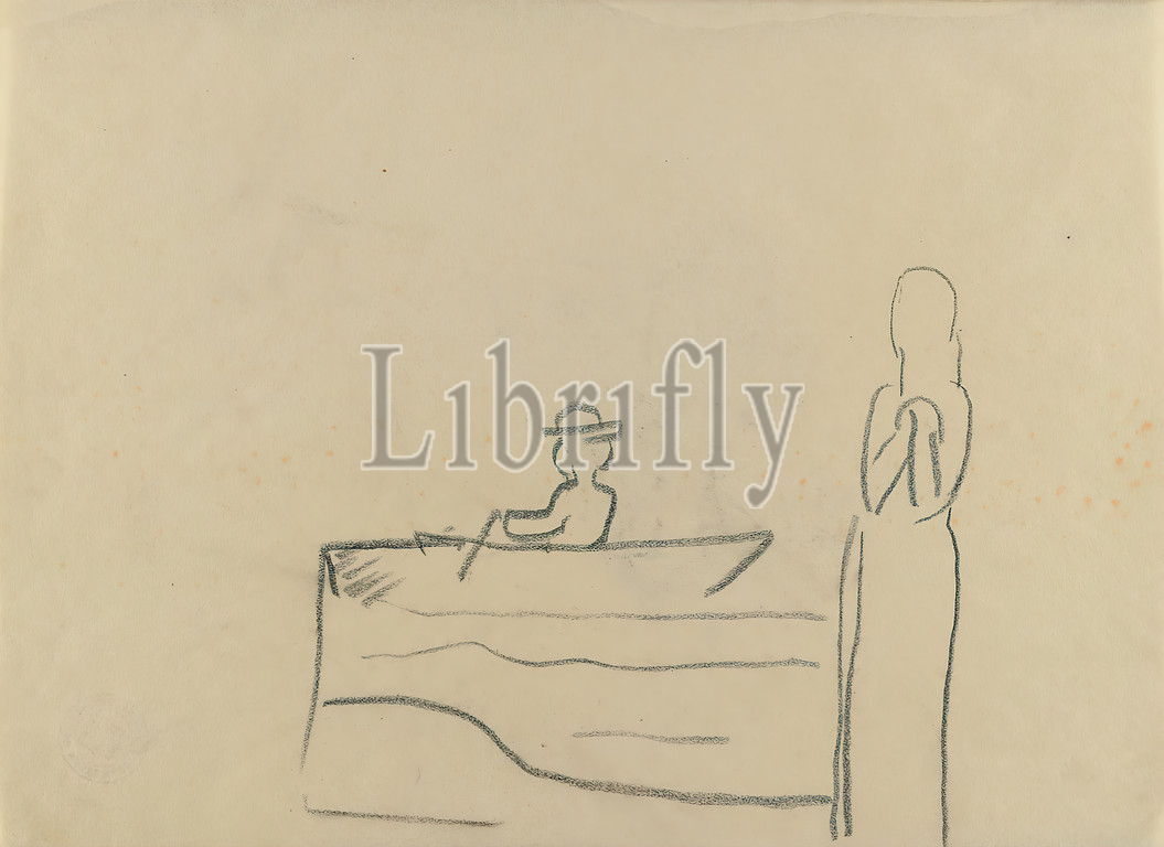 Gustav Heinrich Wolff, sketchbook September/October 1929, parchment, drawing charcoal, drawing, charcoal on parchment, total: height: 26.8 cm; width: 20.8 cm, cover inscribed in the middle of the front Sept, Oct 1929 [1924?]. Sketches, drawing, graphics, Drawing, Boat, Rowing Boat, Canoe, Standing Figure, Classic Modernism, Sketchbook with 12 sheets, but only one drawing on one sheet: Man with hat in rowing boat and contours of a standing figure (compare similar siren scenes by Wolff).