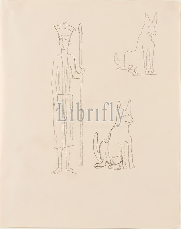 Gustav Heinrich Wolff, Sketches of a standing figure with lance and two dogs or wolves, pencil, paper, drawing, pencil on paper, Total: Height: 22,1 cm; Width: 17,2 cm, drawing, graphics, sketches, standing figure, human and animal, dog, wolf, lance, classic modernism, Three sketches on one sheet: Guardian figure with hat and lance and two sitting dogs or wolves, from the sketchbook 1925-26.