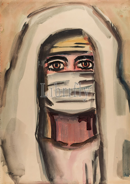 Gustav Heinrich Wolff, Sphinx-face (head of a Bedouin woman), cardboard, watercolor, watercolor on cardboard, total: height: 51 cm; width: 36,4 cm, recto lower left monogrammed and dated with pen GHW 29. inscribed with pen at the lower back side: Sphinx - face, drawing, graphics, painting, portrait, head, face, headgear, national costume, regional costume, peoples and nationalities, classical modernism