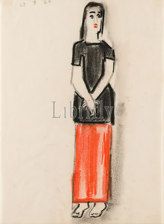 Gustav Heinrich Wolff, Standing female figure with red skirt, parchment, crayon, drawing, black and orange-red chalk on parchment, total: height: 27 cm; width: 19.7 cm, dated: recto p. li. 23 9 24, drawing, graphics, sketches, standing figure, woman, skirt, classical modernism, standing female figure in long dress or black top and red skirt, barefoot and with hands crossed in front of the abdomen, dated 23 9 24, from sketchbook IX.1924 .
