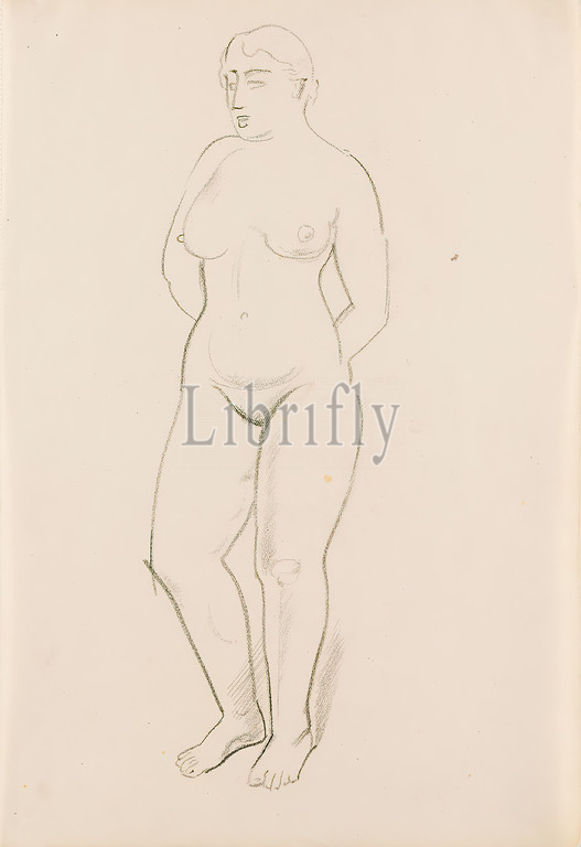 Gustav Heinrich Wolff, Standing Female Nude, drawing paper, drawing charcoal, drawing, charcoal, drawing paper, drawing, graphics, sketches, standing figure, standing female nude, female nude, Classic Modernism, sketch, standing female nude, arms crossed, back, sketchbook early 1928