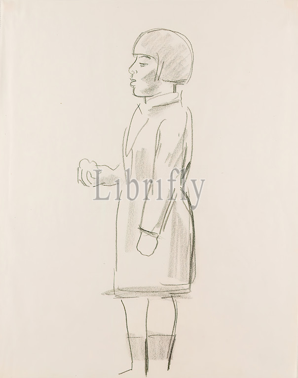 Gustav Heinrich Wolff, standing, profile, garlic seller?, drawing paper, drawing charcoal, drawing, charcoal, drawing paper, slightly trimmed lower right?, drawing, graphics, Sketches, Standing Figure, Woman, Fashion, Clothing, Hairstyle Fashion, Hair Fashion, Market, Classic Modernism, Standing Woman, Pageboy Cut, Dress, Scarf, Holding Something, Right Hand, Sketchbook early 1928, Cf, sketch Inv.nr, EG1989.1.250, inscribed, de lail!, garlic!