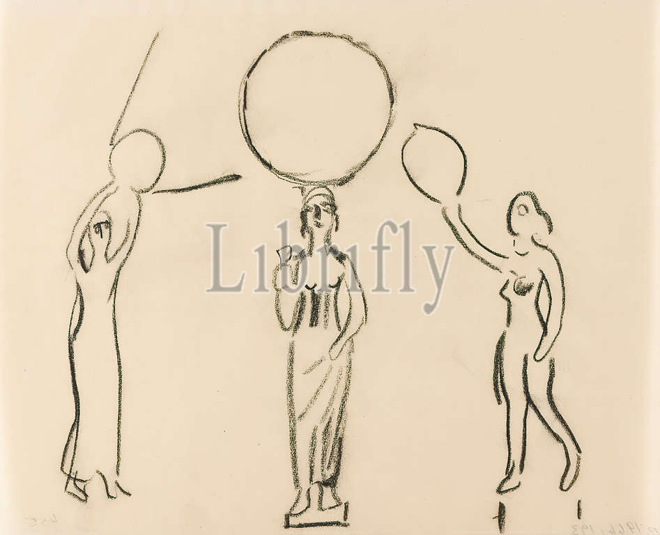Gustav Heinrich Wolff, Standing Woman, Mirror, Three Studies, parchment, charcoal, drawing, drawing, charcoal, parchment, unmarked, sketches, design drawings, drawing, graphics, standing figure, postures, positions, human figure, sculpture, sculpture, sculpture art, classical modernism, Standing female figure, robe, small base, circle, head, mirror?, on, left, right, holding another female figure, round, hands diagonally upwards, Single sheet, Bl, December 1924, partly created, Wolff's stay, Hamburg