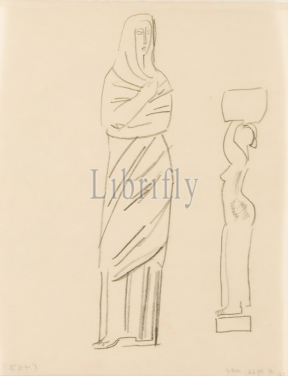 Gustav Heinrich Wolff, study sheet, standing garment figure, II, and basket bearer, pencil, vellum, drawing, pencil, vellum, unmarked, sketches, design drawings, drawing, graphics, standing figure, headgear, postures, positions, human figure, sculpture, sculpture, sculpture art, classical modernism, sketch, female figure, garment, head veil, front view, basket, jug bearer standing, pedestal, profile, left, Obviously design, sculpture, cf, Krugträgererin, 1930, Holthusen 1964, sculpture no, pg, December 1924, partly created, Wolff's stay, Hamburg