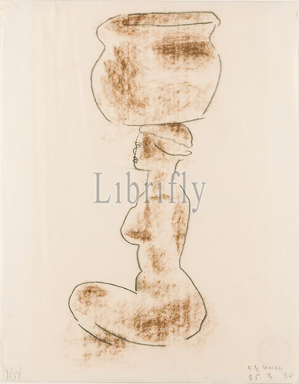 Gustav Heinrich Wolff, study of a sitter with a vessel on her head, drawing paper, pastel chalk, drawing charcoal, drawing, charcoal and pastel on drawing paper, total: height: 25.6 cm; width: 32.8 cm, recto lower right in pencil probably inscribed by someone else (?) and dated: e. G. Wolff, 25.3.30. Lower left (by someone else?) inscribed in pencil: I/37th, sketches, drawing, graphics, woman, seated figure, seated female nude, classical modernism