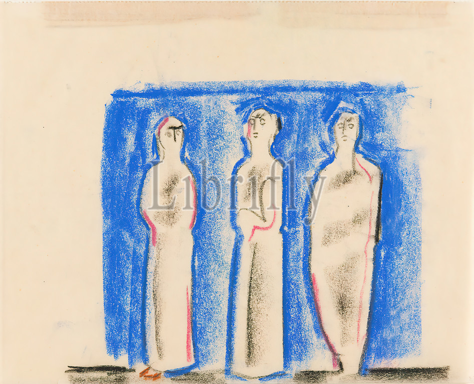 Gustav Heinrich Wolff, Three standing figures, front, blue background, parchment, drawing charcoal, pastel chalk, drawing, charcoal, blue, red pastel chalk, parchment paper, unmarked, sketches, drawing, graphics, standing figure, blue, Classic Modernism, color sketch, three full figures standing next, en face, Bl, December 1924