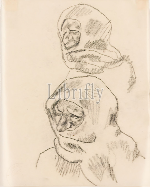Gustav Heinrich Wolff, Two head studies, pencil, vellum, drawing, pencil on vellum, Total: Height: 14,5 cm; Width: 11,4 cm, dated: verso and: (by someone else? ) with pencil: 4.1.34, drawing, graphics, Sketches, Head, Face, Headgear, Classical Modernism, Two Studies of a Head Wrapped in a Headscarf, from the Sketchbook 1932-34