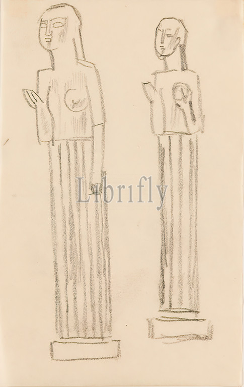 Gustav Heinrich Wolff, Two studies, statuette, pencil, parchment, pencil, parchment, drawing, graphics, sketches, design drawings, standing figure, history, Minerva, Pallas, Athena, Classic Modernism, design sketches, statuette, bronze sculpture Pallas, sketchbook 1923