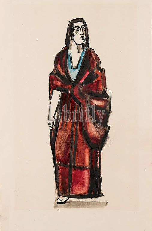 Gustav Heinrich Wolff, woman in long robe with cape, ink, cardboard, drawing technique, painting technique, ink in black, red, blue on cardboard, Total: Height: 29.8 cm; Width: 19.6 cm, monogrammed: verso: GHW, monogrammed, inscribed and dated: verso: GHW, für Max Sauerlandt, am 3. January 3, 1925, drawing, graphics, painting, woman, standing figure, jacket, cloak, cape, cape, Classic Modernism, woman in long, antique robe with cape looking to the right, inscribed by the artist on the reverse for Max Sauerlandt, on January 3, 1925 and monogrammed GHW.