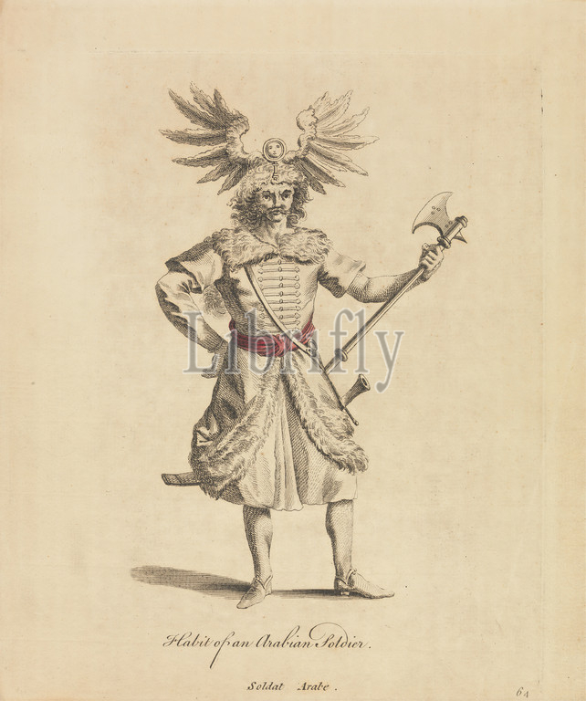 Habit of an Arabian Soldier, Print made by unknown artist, after Hans Weigel, active 1549–1577, German, between 1757 and 1772, Etching and watercolor on medium, cream, slightly textured, laid paper, Sheet: 11 x 19 1/4 in. (27.9 x 48.9 cm), portrait