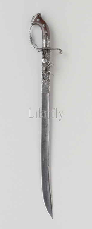 Hack, flint gun, Combination, hack, iron hilt, embossed, embellishments, dolphin, riser, sawn ornaments, acanthus leaves, hilt knob, shape, handle, gun, curved blade, top, leafy tendrils, engraved, outside, emblem consisting, arm emerging, cloud, falchion attached, text Concordia res Parvae CresCunt, branched foliage, carrying side, man, hat, text Credens Pro nobis Quis Consientius, branched branches, gun lock, mounted, barrel, ring, rear, trumpet, blade, Netherlands, 1655, 1660, iron, metal, engraving, l 79