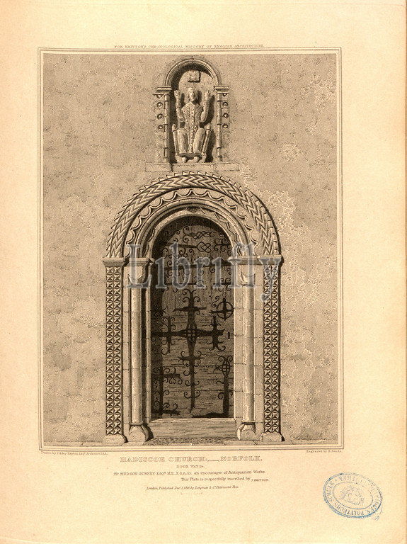 Haddiscoe Church, Norfolk, doorway, Porte of St Mary's Church at Haddiscoe in Norfolk, signed: Drawn by J. Adey Repton; Engraved by R. Sands; Published by Longman & Co, Fig. 16, p. 260, Repton, John Adey (drawing); Sands, Robert (engraving); Longman & Co. (published), 1818, John Britton: The architectural antiquities of Great Britain: represented and illustrated in a series of views, elevations, plans, sections and details of various ancient English edifices: with historical and descriptive accounts of each. Bd. 5. London: J. Taylor, 1807-1826