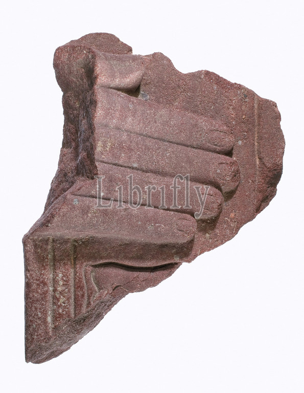 Hand, stelophorous statue, part, Horus name, Akhenaten, New Kingdom, Amarna Period, Dynasty 18, ca, 1353–1336 B.C, Egypt, Middle Egypt, Amarna, Akhetaten, Great Temple, Aten, pit outside southern wall, Petrie/Carter excavations, 1891–92, Red quartzite, H, 21 x W, 15 D, 7 cm, width, inner column lines 10.7