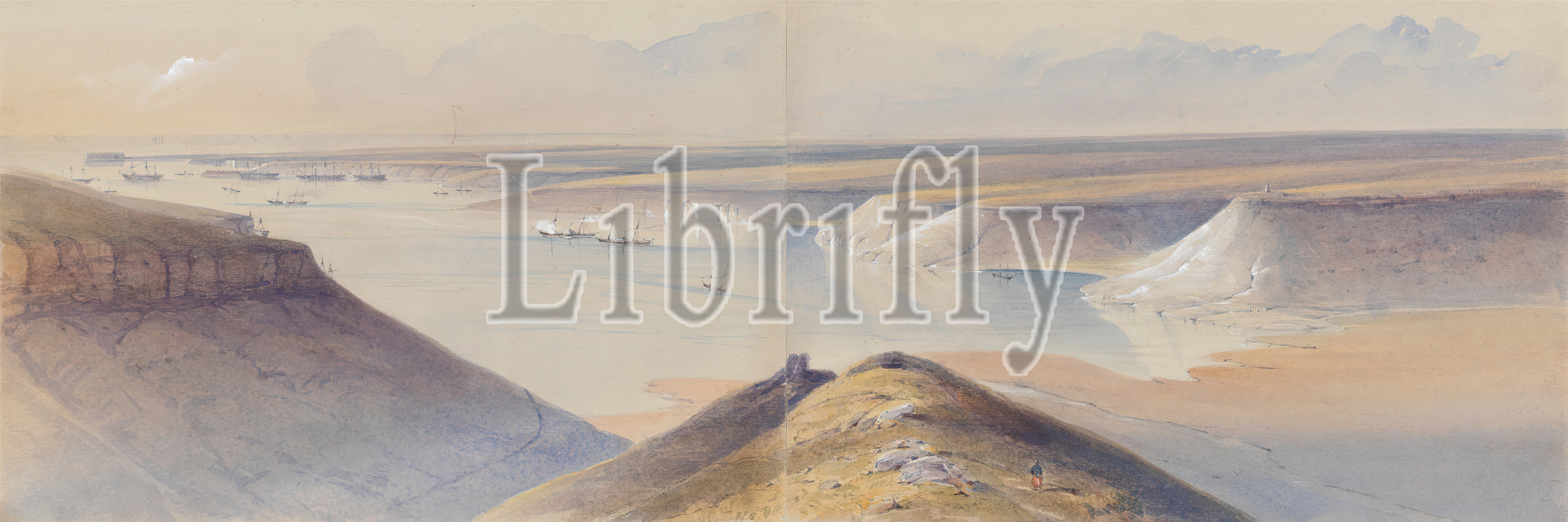 The Harbour of Sebastopol, Gaspard Le Marchant Tupper, 1862–1906, 1854, Watercolor, white gouache on moderately thick, slightly textured, light blue, wove paper, Sheet: 6 7/8 x 20 3/8 inches (17.5 x 51.8 cm), bay, boat, cape, cliff, coast, fleet, fog, harbor, harbour, marine art, navy, ocean, russia, sea, ship, water, wind
