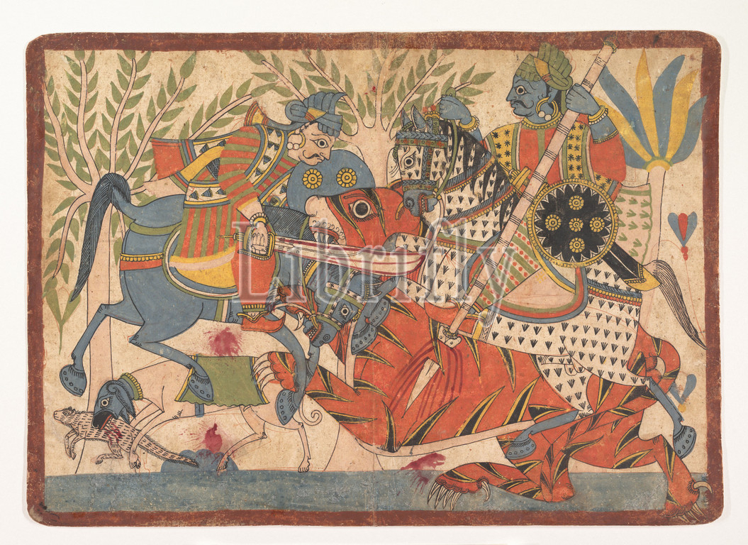 “Harishchandra and his Minister Killing a Tiger,” folio from a Harishchandra Series, 1800–1850, Western India, Maharashtra, Paithan or northern Karnataka, Opaque watercolor and ink on paper, 12 3/8 x 17 3/8 in. (31.4 x 44.1 cm), Paintings, Killing a tiger in personal combat was seen as the ultimate feat of valor in Indian martial society. It is not surprising, then, that this dynamic moment in the Harishchandra narrative, a Hindu religious epic, was chosen for illustration