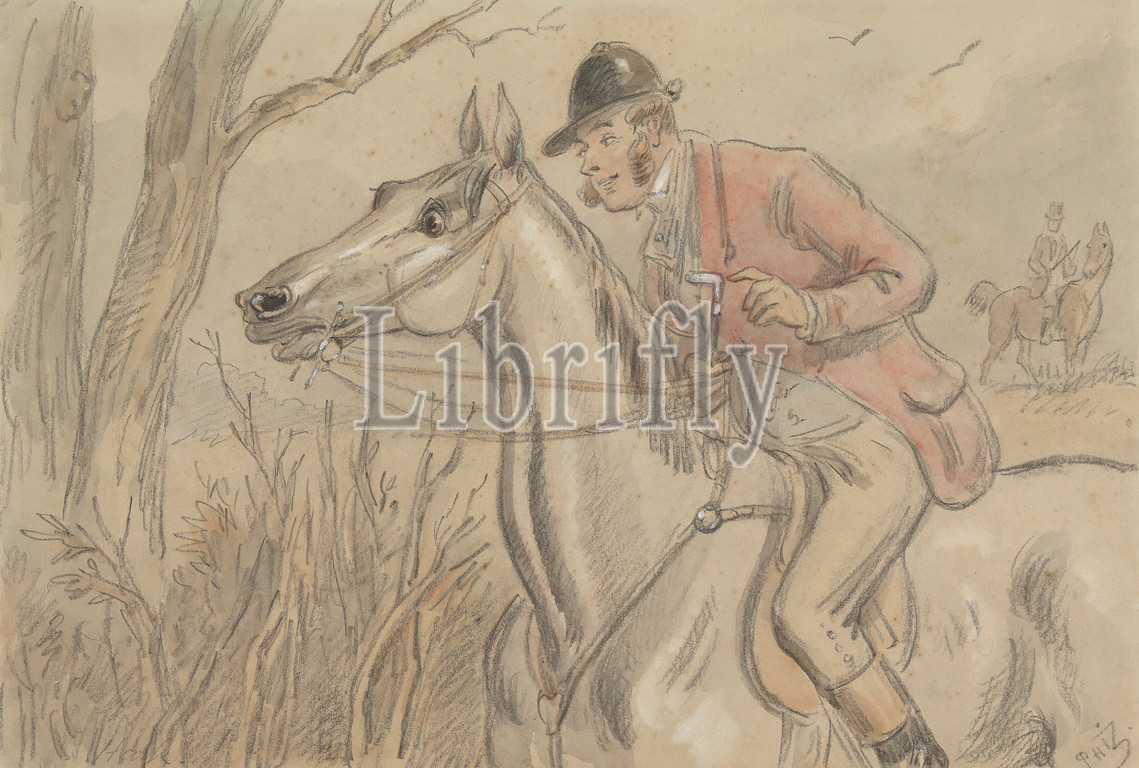 Hark, Startled Horse, Alert Rider, Hablot Knight Browne, 1815–1882, British, Graphite, watercolor, white gouache, medium, slightly textured, gray wove paper, Contemporary drawn border, Sheet, birds, caricature, grass, horseback riders, horseback riding, horses, animals, hunt, hunters, hunting, men, sporting art, trees, woods