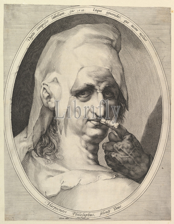Harpocrates, Philosopher, ca, 1611, Engraving, first state, two, 19, 14 5/8, 48.2, 37.2 cm, Prints, Jan Muller, Netherlandish, Amsterdam, 1571–1628