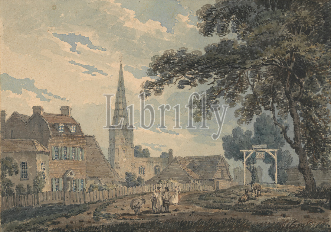 Harrow-on-the-Hill, Middlesex, Thomas Girtin, 1775–1802, British, ca, 1794, Watercolor, pen, black ink, graphite mounted, moderately thick, moderately textured, beige, wove paper, Sheet, Mount, cathedral, clouds, fence, figures, genre subject, houses, road, trees, windows, England, Europe, Harrow, Hill, Middlesex, United Kingdom