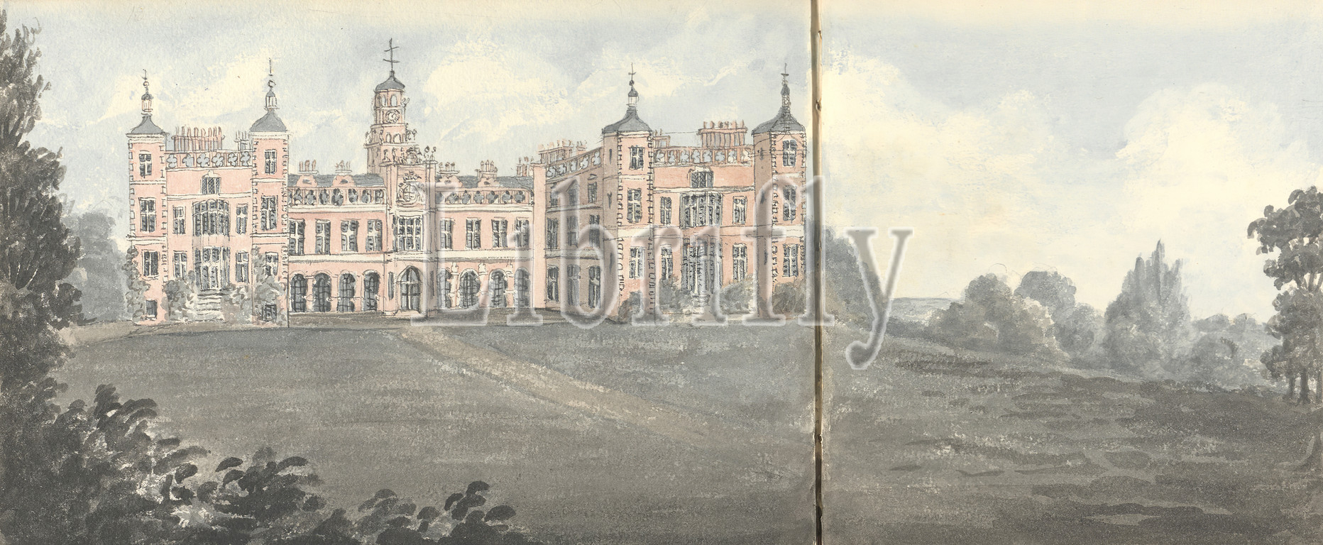 Hatfield, July 2, 1832, Anne Rushout, ca. 1768–1849, British, 1832, Watercolor, pen and black ink, and graphite on moderately thick, slightly textured, cream wove paper, Sheet: 6 3/4 × 20 inches (17.1 × 50.8 cm), architectural subject