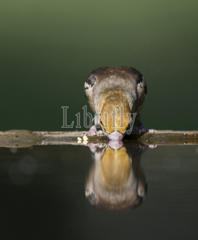Hawfinch female drinking, Coccothraustes coccothraustes