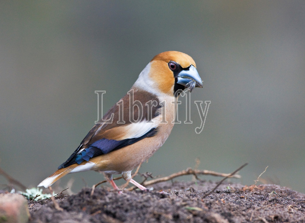 Hawfinch perched on ground with food, Coccothraustes coccothraustes