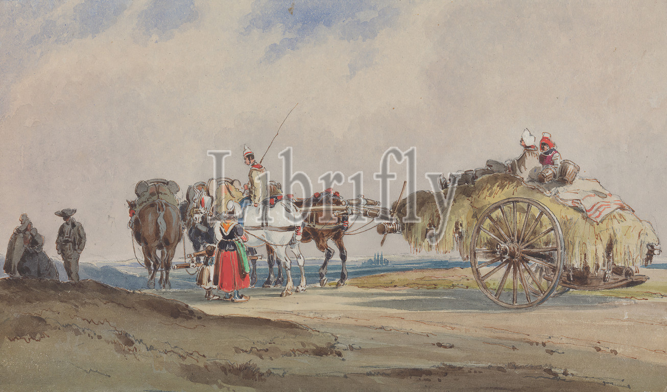 A Hay Wagon Drawn by Four Horses, Charles Cooper Henderson, 1803–1877, British, undated, Watercolor, with pen, in brown ink, over graphite with traces of, white gouache on moderately thick, moderately textured, cream, wove paper; mounted on, thick, moderately textured, beige, wove paper, Mount: 9 7/8 × 14 inches (25.1 × 35.6 cm), Contemporary drawn border: 7 3/16 × 11 5/8 inches (18.3 × 29.5 cm), and Sheet: 6 1/4 × 10 5/8 inches (15.9 × 27 cm), cart, children, genre subject, hay, horses (animals), landscape, men, wagon, women