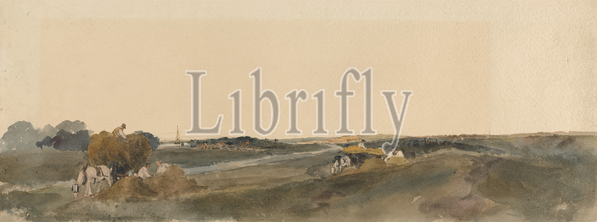 Haymaking on the Banks of a Lincolnshire River, attributed to Peter DeWint, 1784–1849, British, ca. 1820, Watercolor and graphite on moderately thick, rough, cream wove paper, Sheet: 7 1/4 x 19 1/8 inches (18.4 x 48.6 cm), carts, figures, genre subject, hay, horses (animals), rivers, Lincolnshire, United Kingdom