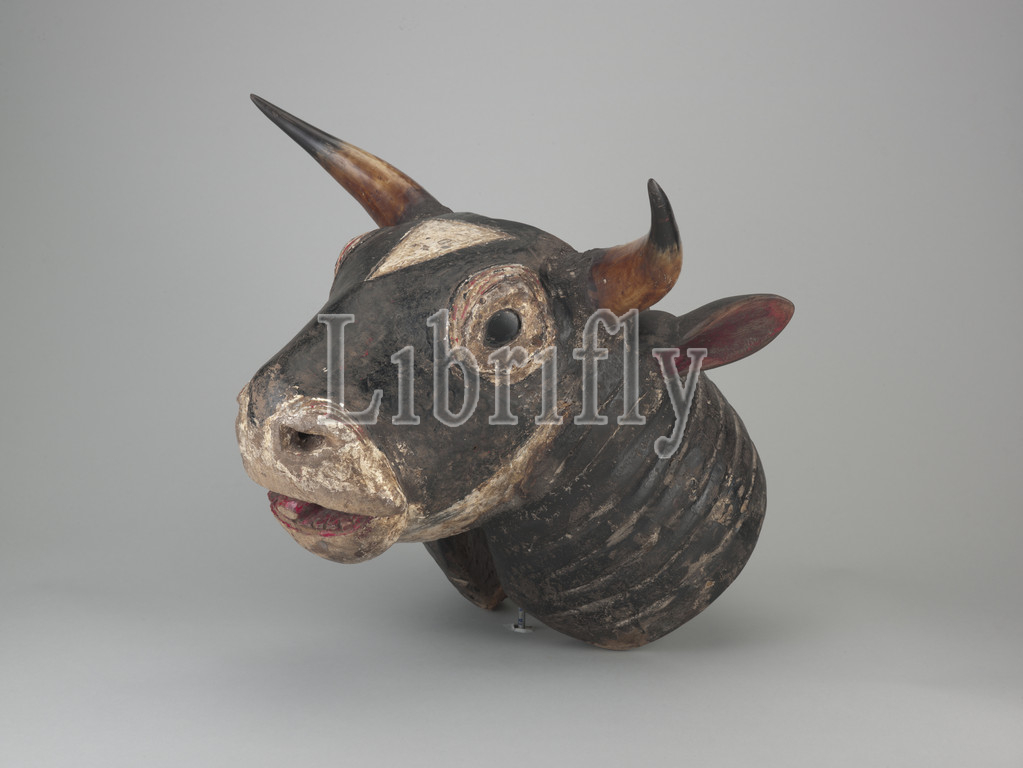 ox head helmet mask, Bidjogo people, 20th century, wood, horn, pigment, glass, iron, mastic, 16-1/2 x 20-1/4 x 18-1/2 in., African Art