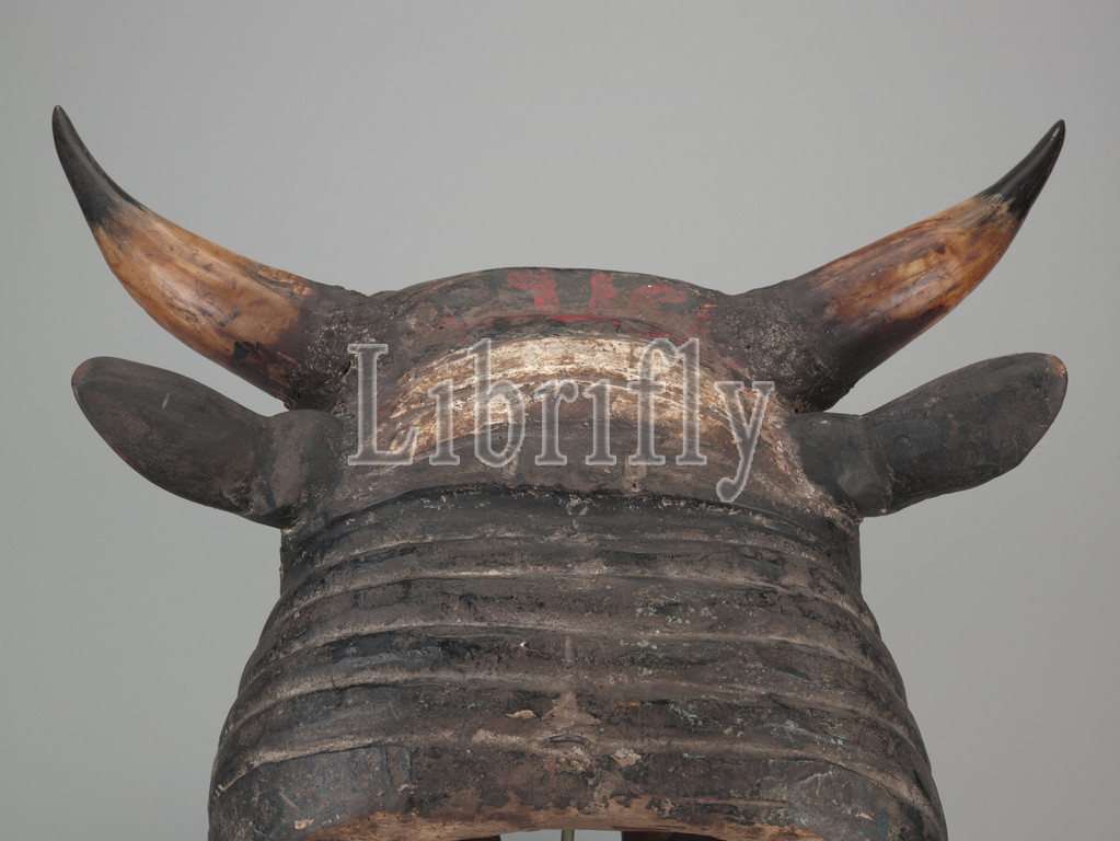 ox head helmet mask, Bidjogo people, 20th century, wood, horn, pigment, glass, iron, mastic, 16-1/2 x 20-1/4 x 18-1/2 in., African Art