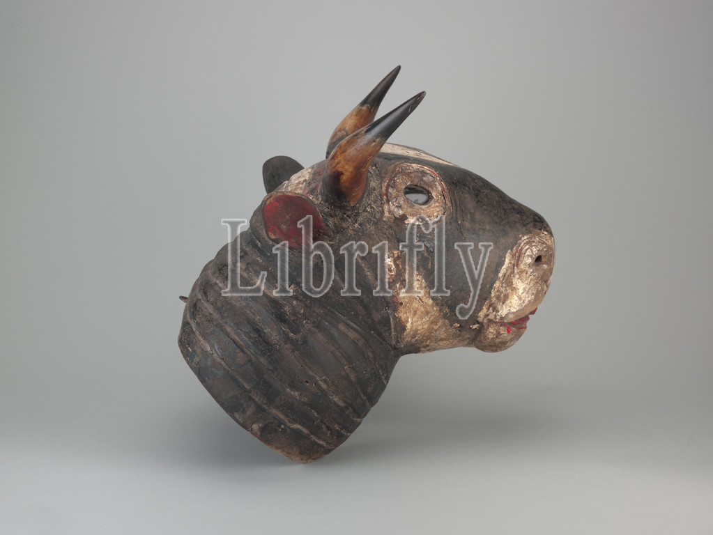 ox head helmet mask, Bidjogo people, 20th century, wood, horn, pigment, glass, iron, mastic, 16-1/2 x 20-1/4 x 18-1/2, African Art